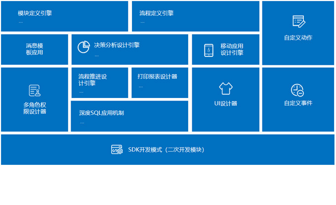 消息模板定义、打印报表设计、移动应用引擎、权限设计等,